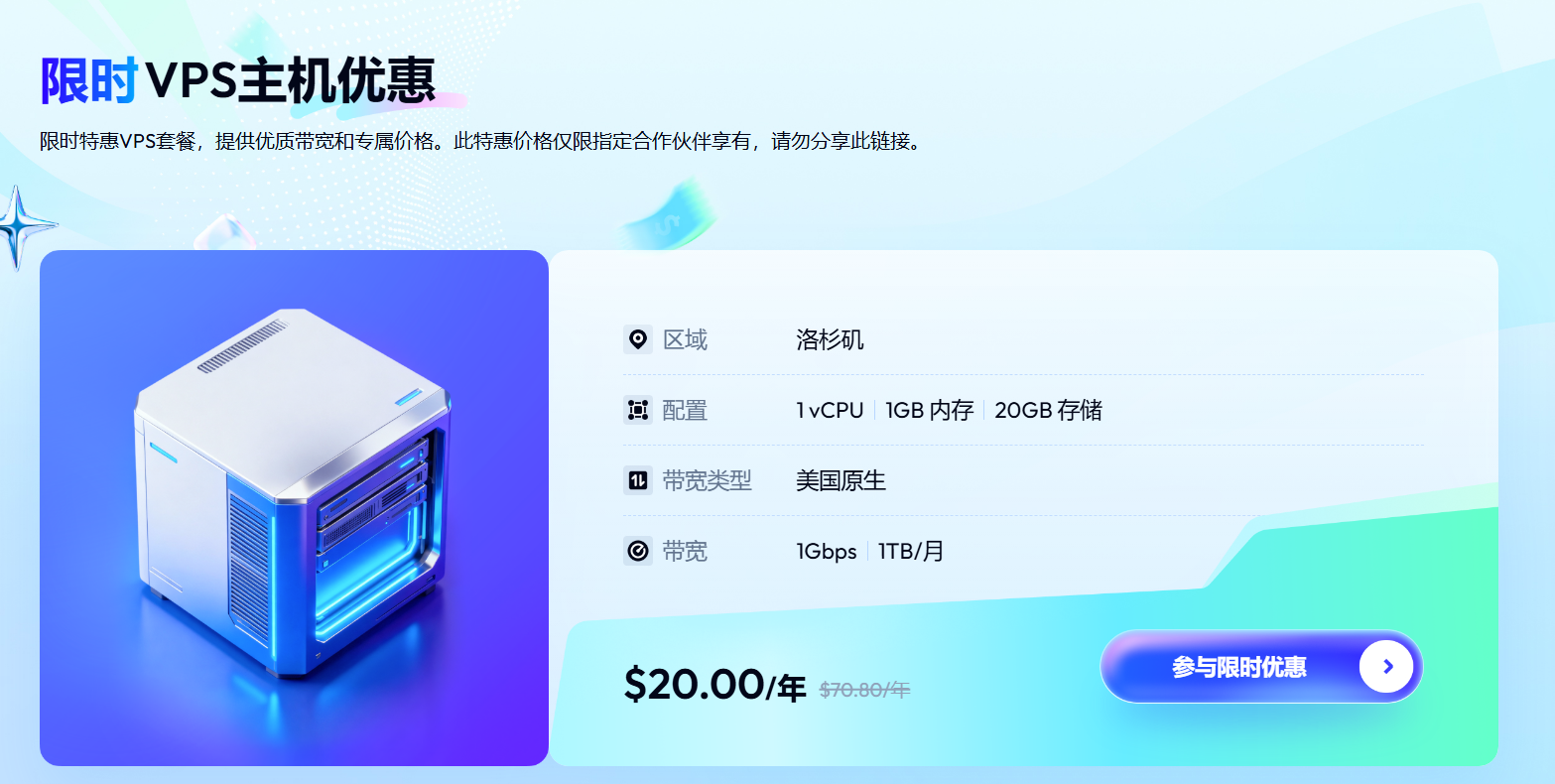这次的活动主要是洛杉矶节点,基础配置都是 1 核 CPU、1GB 内存、20GB NVMe 硬盘,整体走的是够用型路线,不是靠堆参数吸引眼球。区别主要集中在网络线路和带宽上,适合不同使用场景的人自行选择。如果只是需要一台海外环境干净、性能稳定的 VPS,用来部署服务、跑程序或者做测试,这种配置其实已经能覆盖大多数需求。